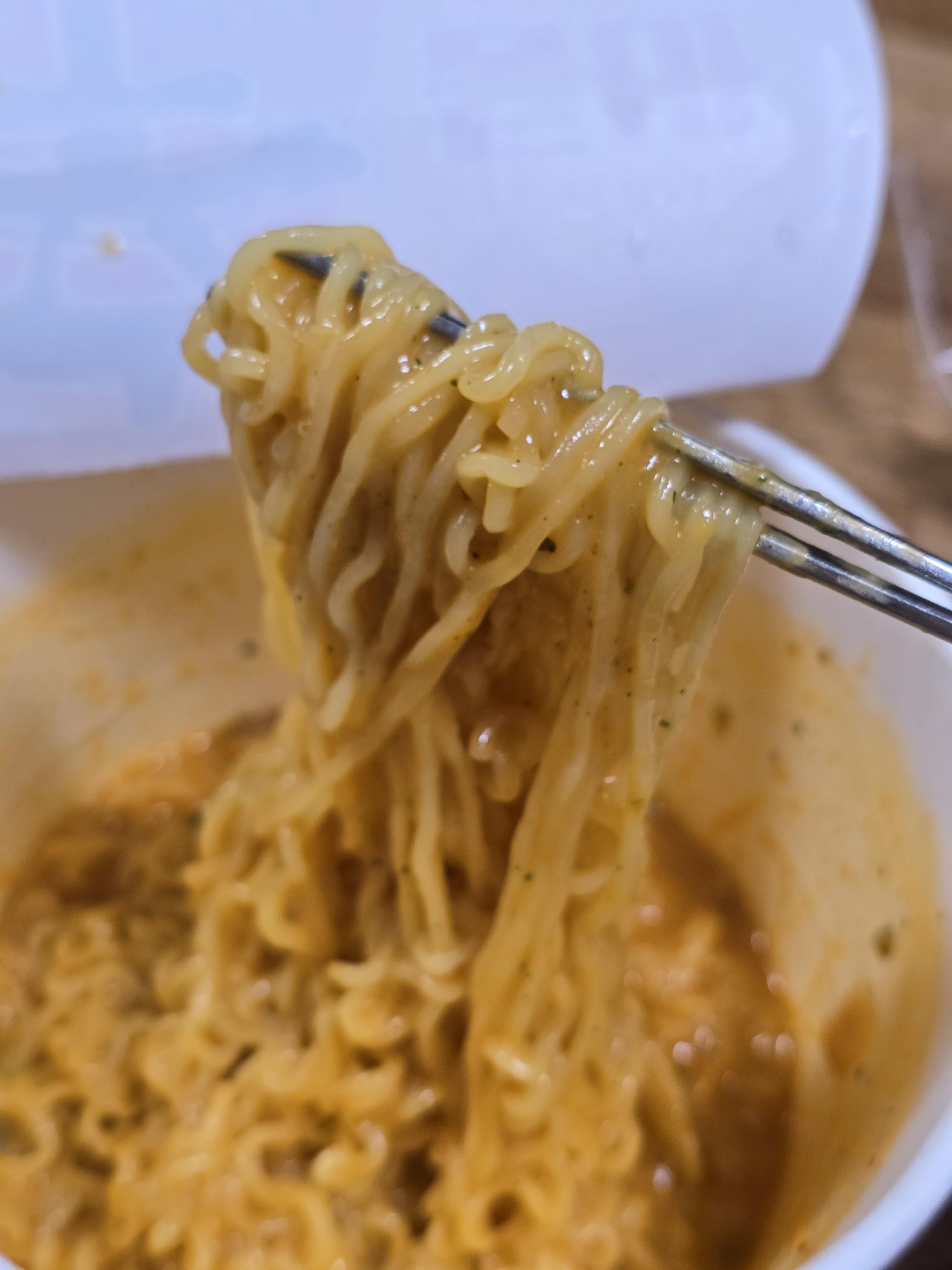 꾸덕하고 쫄깃한 느낌의 면발에 치즈볶이에 신라면의 칼칼한 매운맛이 더해진 느낌이었습니다.
