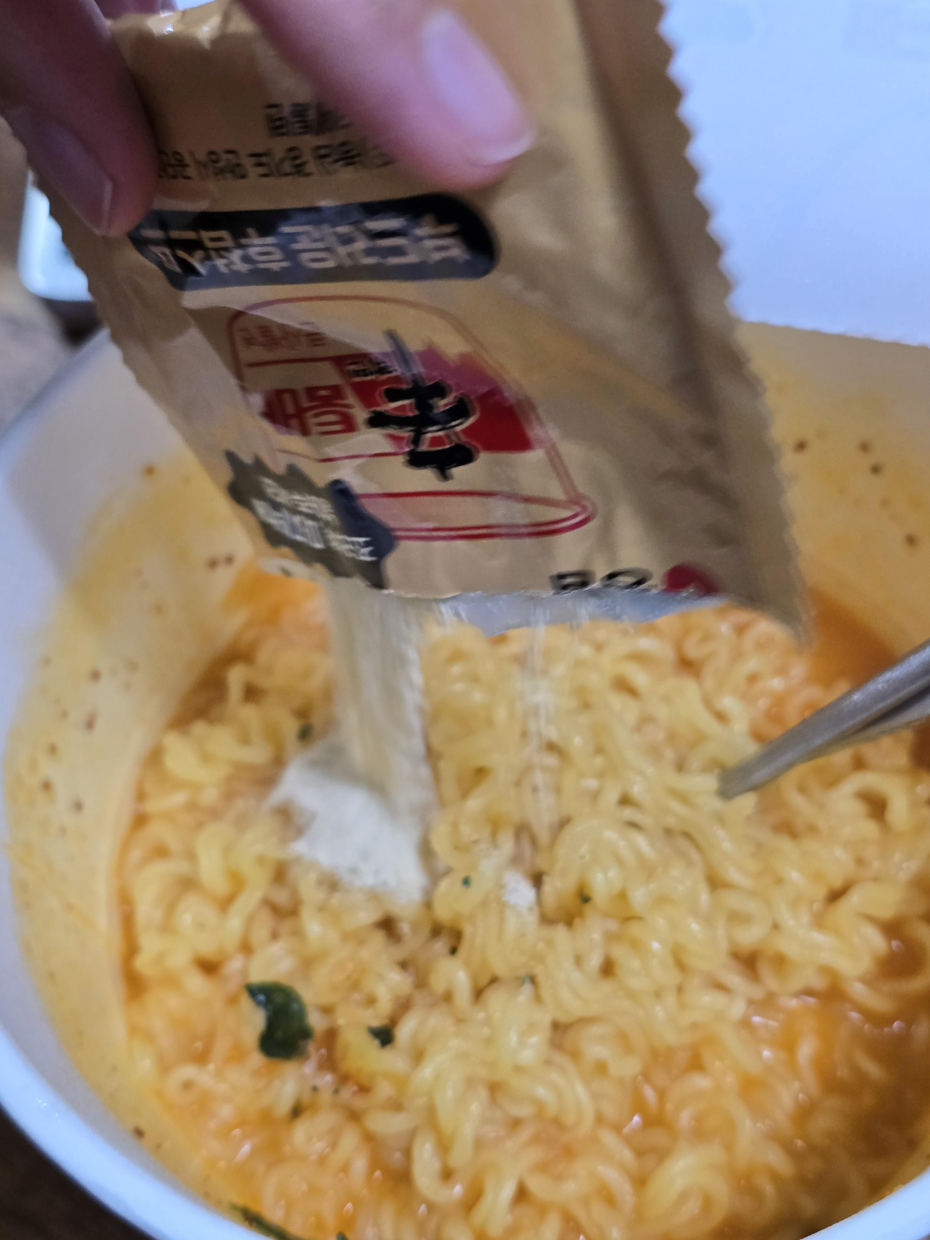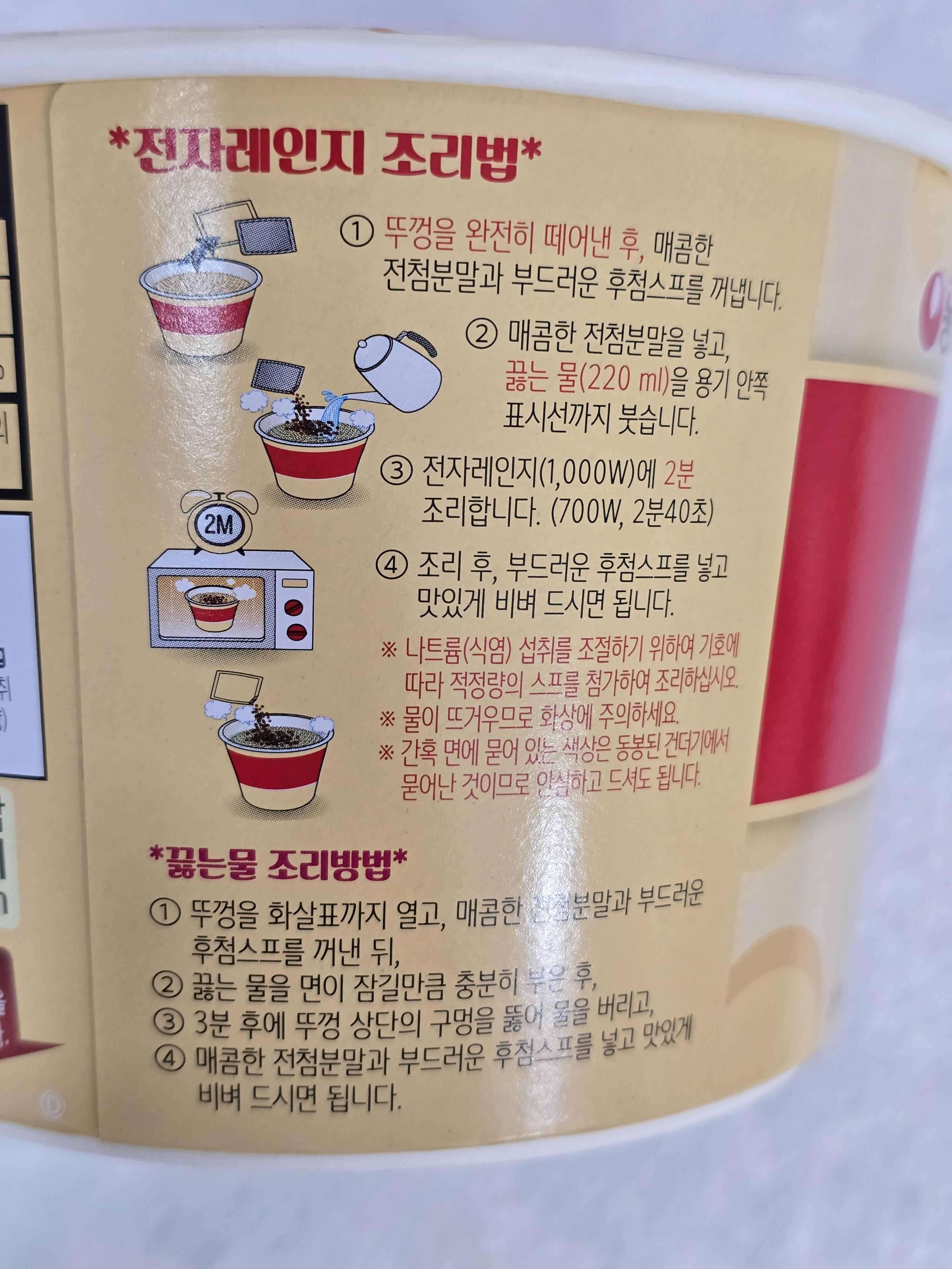 반응형2. 매콤한 전첨분말을 넣고, 끓는 물을 용기 안쪽 표시선까지 붓습니다.
