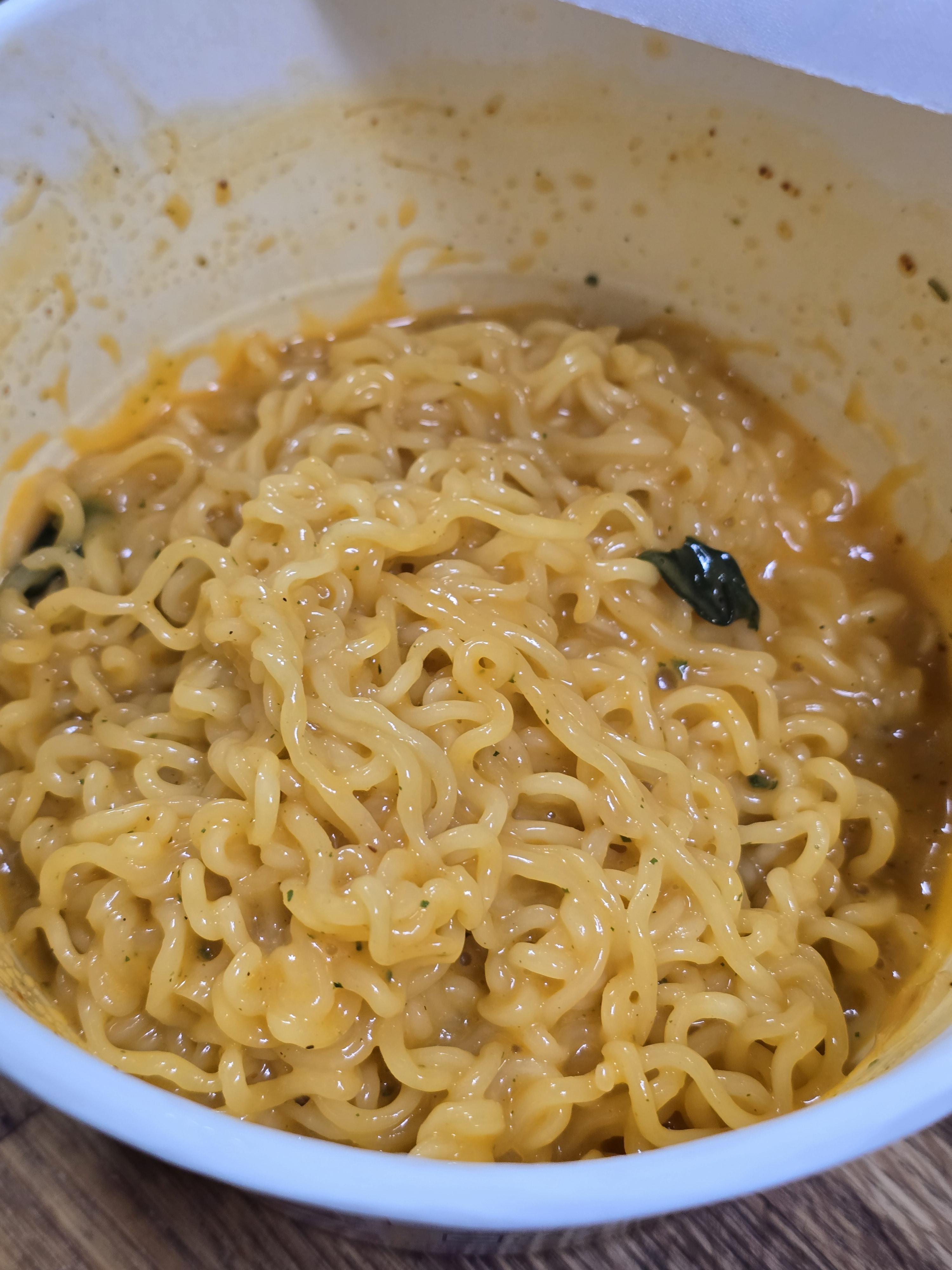 꾸덕하고 쫄깃한 느낌의 면발에 치즈볶이에 신라면의 칼칼한 매운맛이 더해진 느낌이었습니다.
