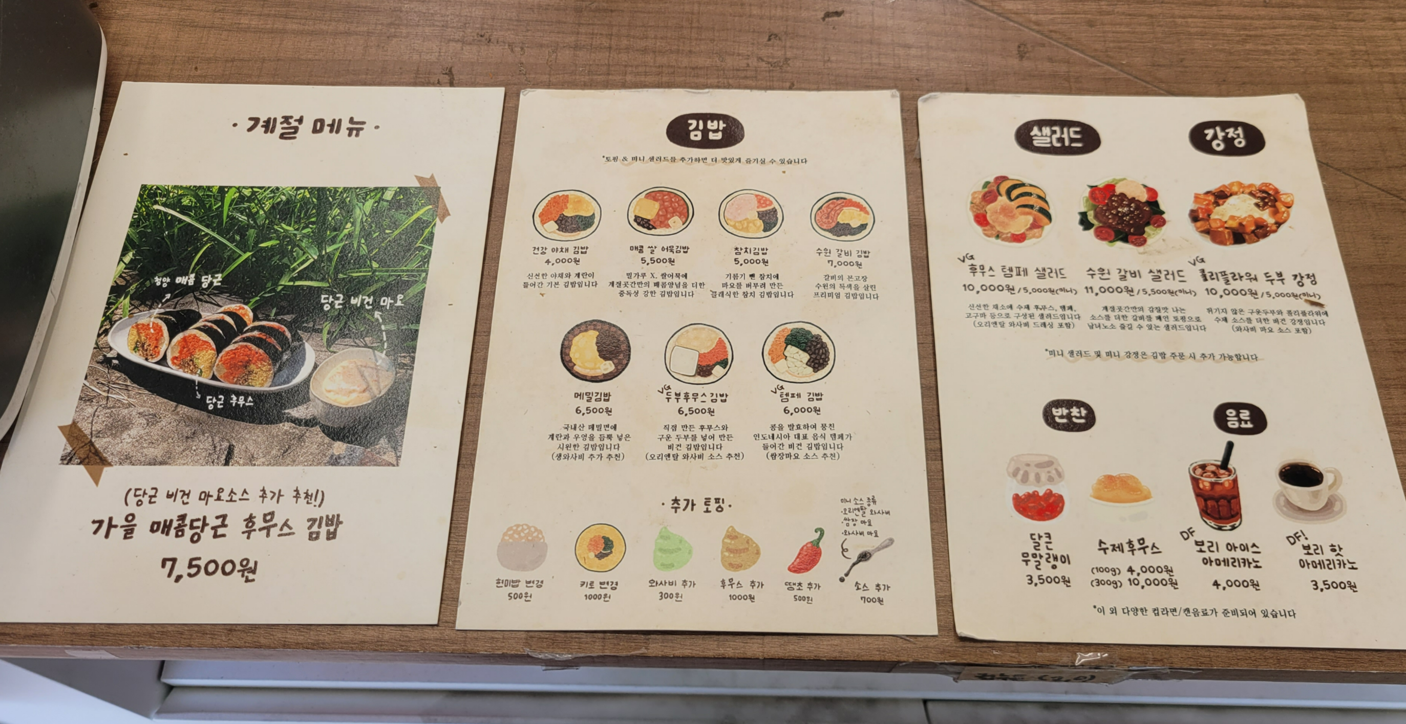 카운터에 메뉴판이 있는데 주메뉴는 김밥이고 사이드 메뉴는 샐러드, 반찬, 음료로 구성되어 있고 김밥은 토핑 추가도 가능합니다.