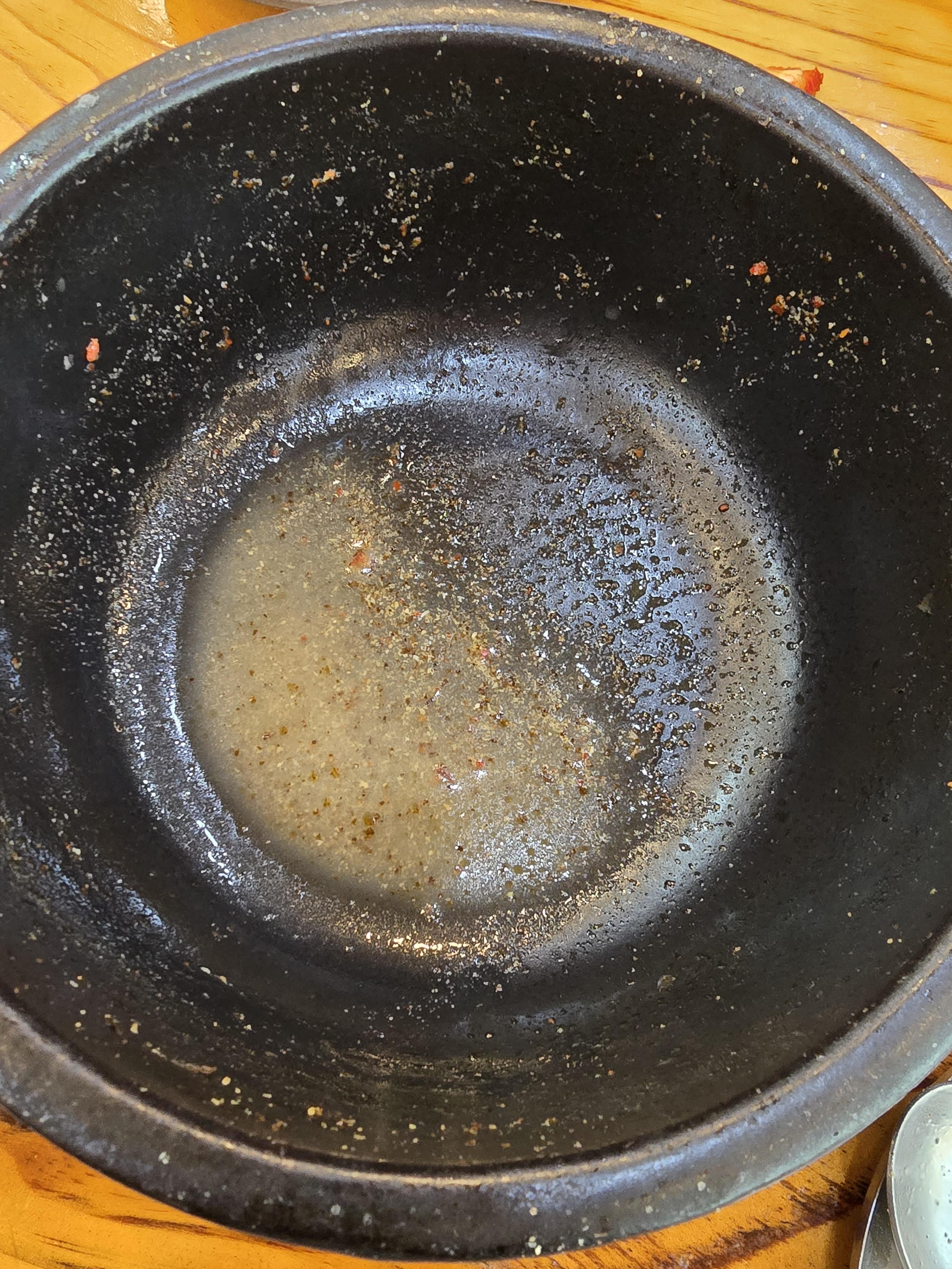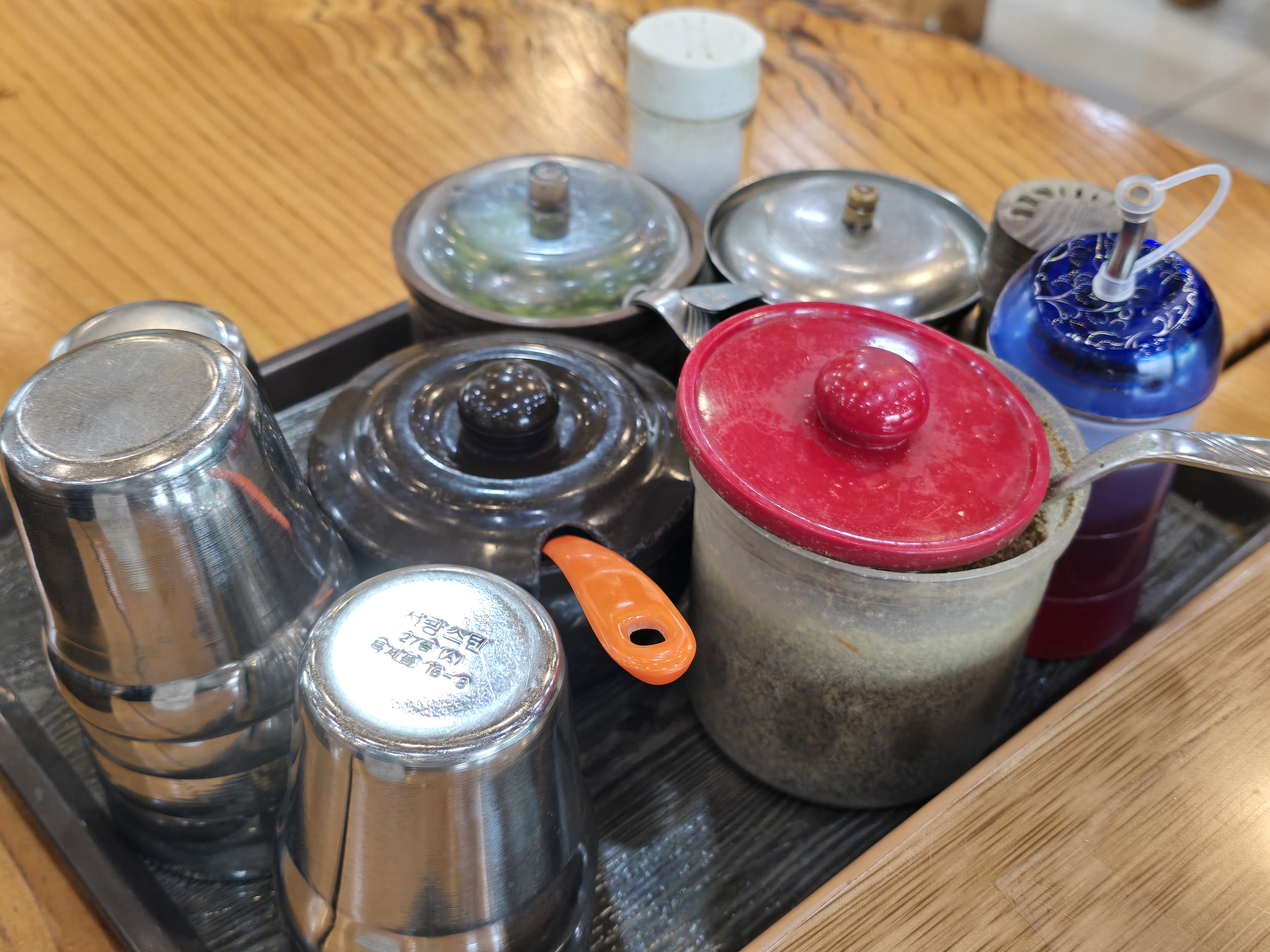 반응형테이블에 들깻가루, 새우젓, 청양고추 슬라이스, 다진 양념, 고추기름, 소금, 후추가 기본양념으로 세팅되어 있습니다.