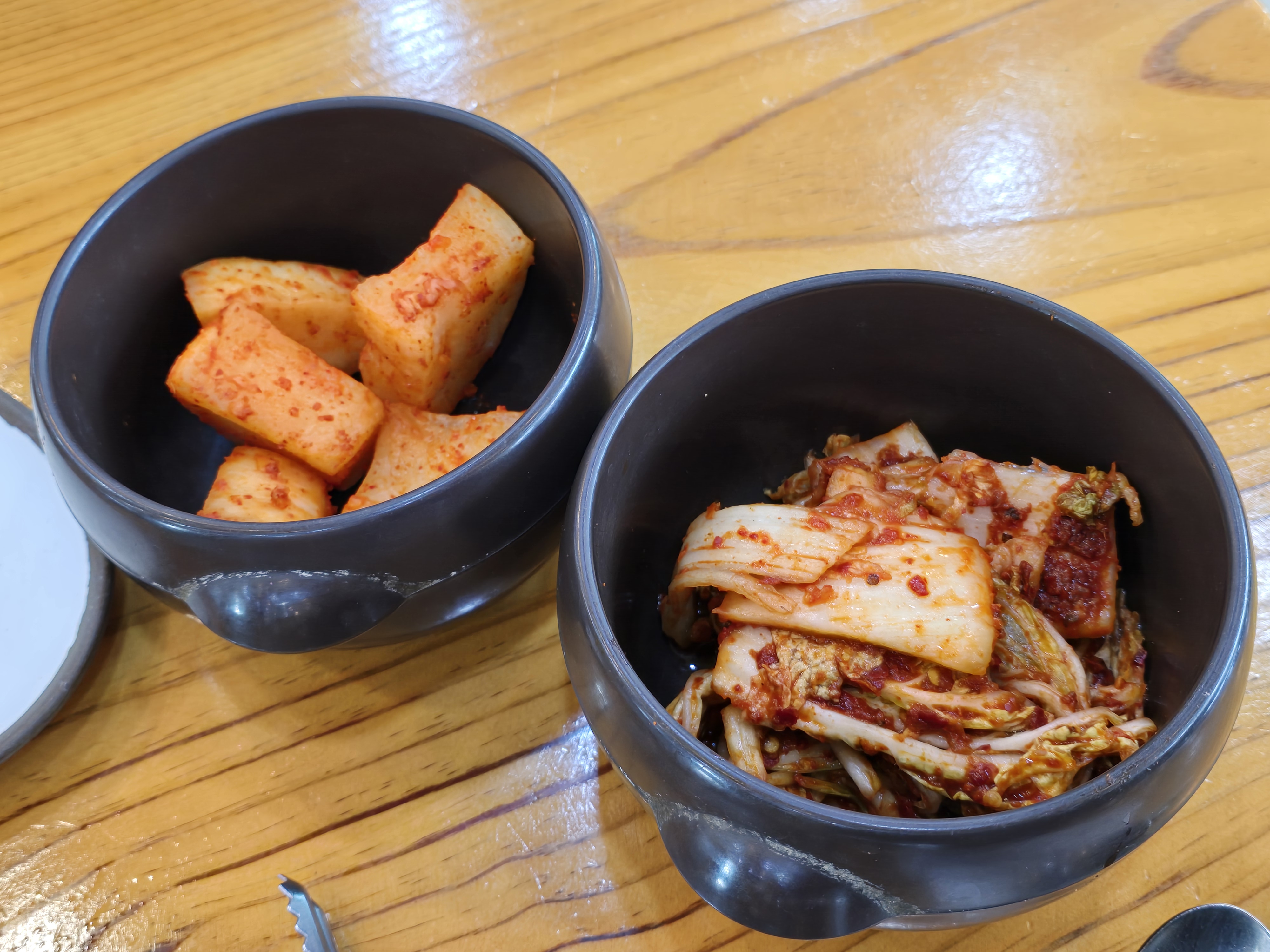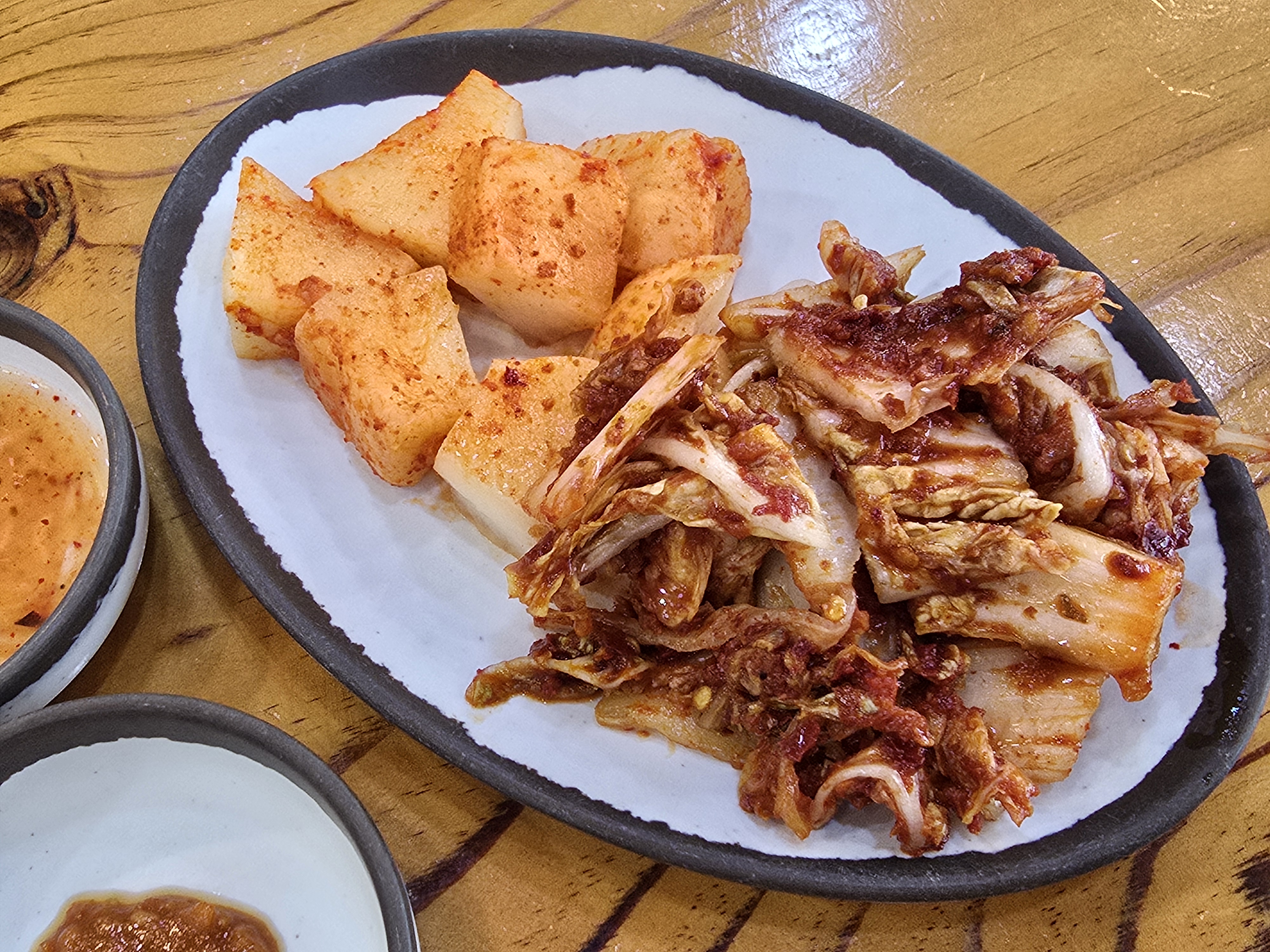 김치는 배추김치와 섞박지를 먹을 만큼 덜어먹을 수 있게 가져다줍니다.