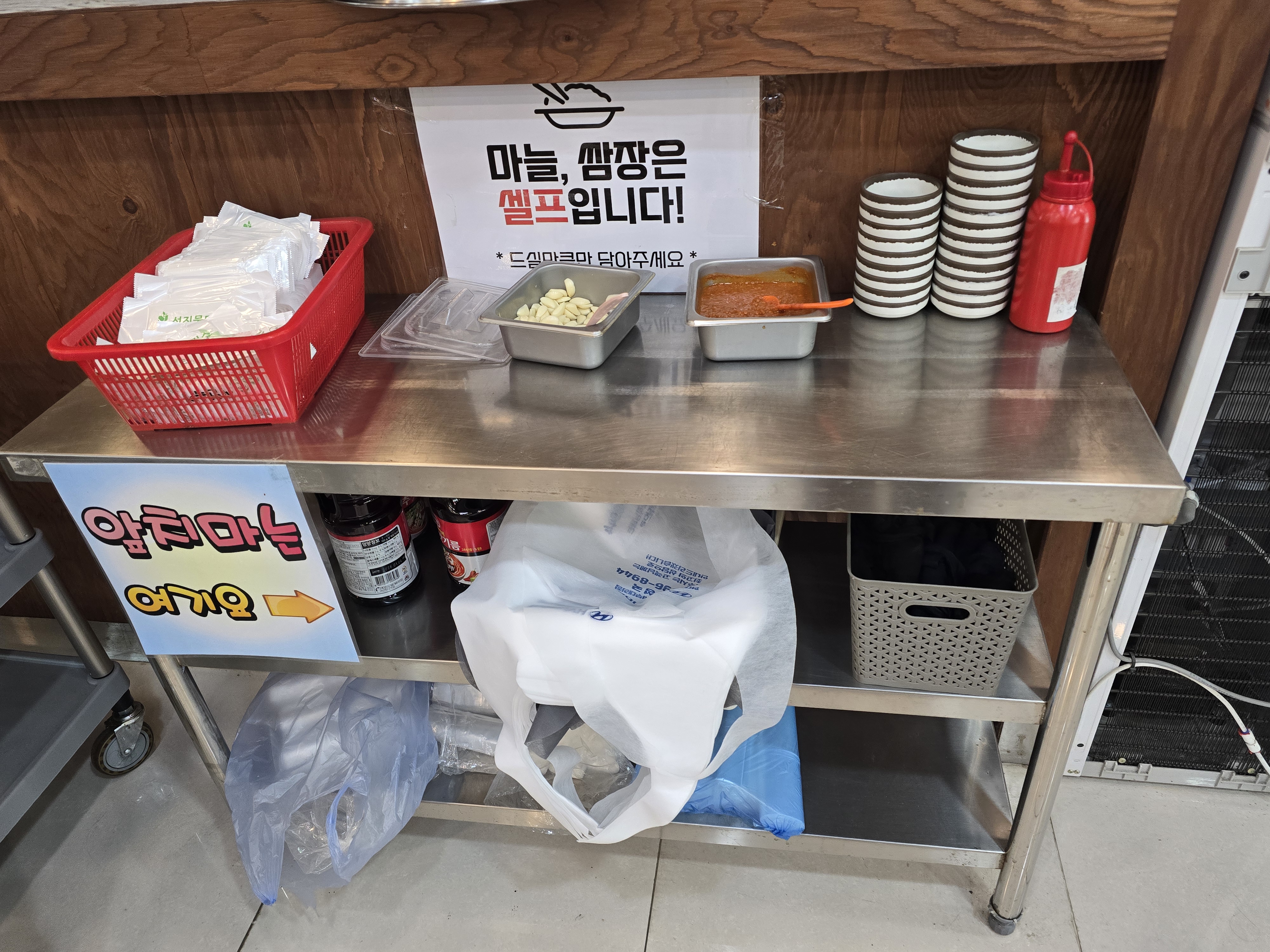순대에 마늘 올려서 먹는 것이 별미여서인지 셀프바도 있었는데 마늘하고 쌈장, 물수건, 앞치마가 있습니다.