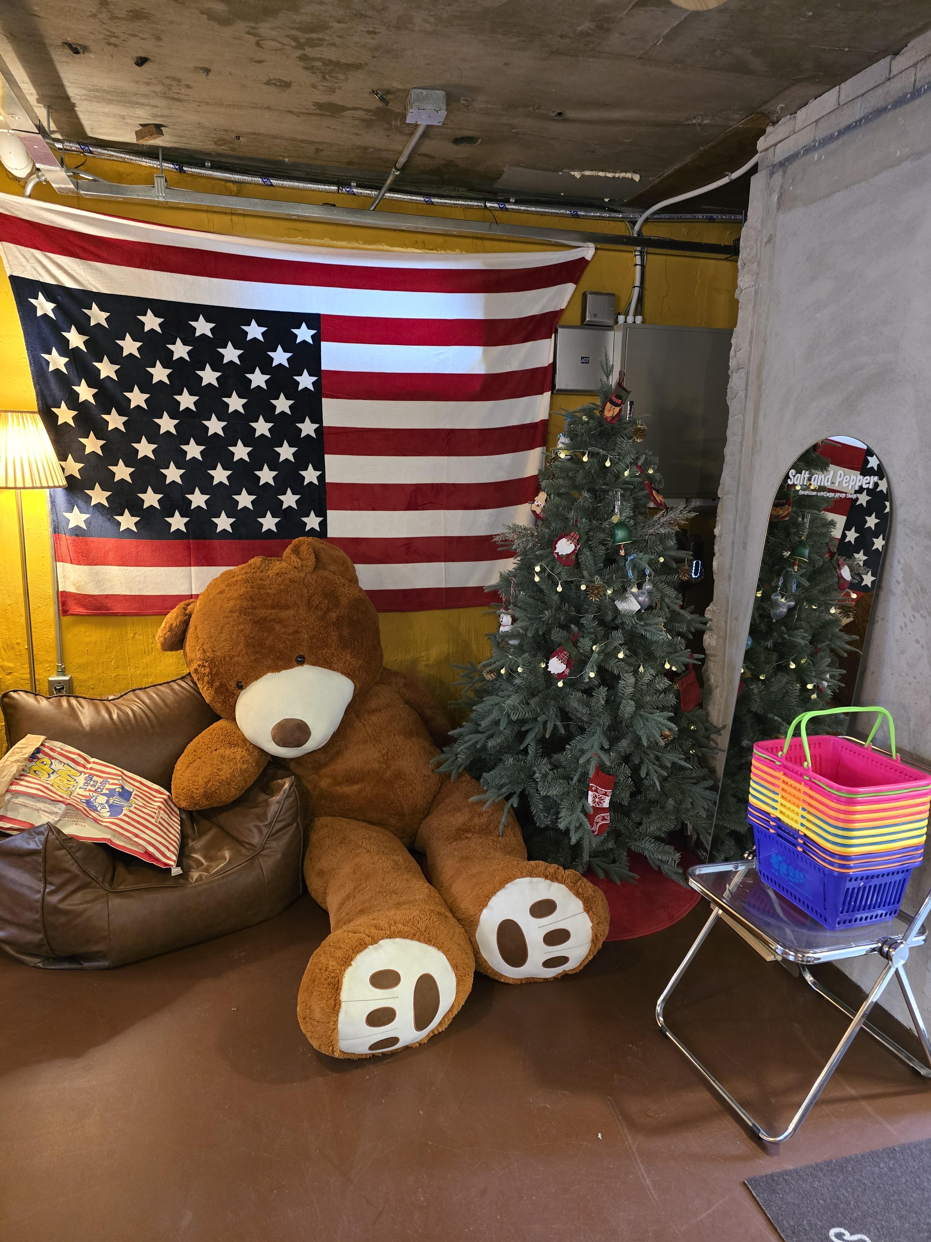 매장 입구에 들어서면 미국 국기와 큰 곰인형과 크리스마스트리 장식이 있습니다.