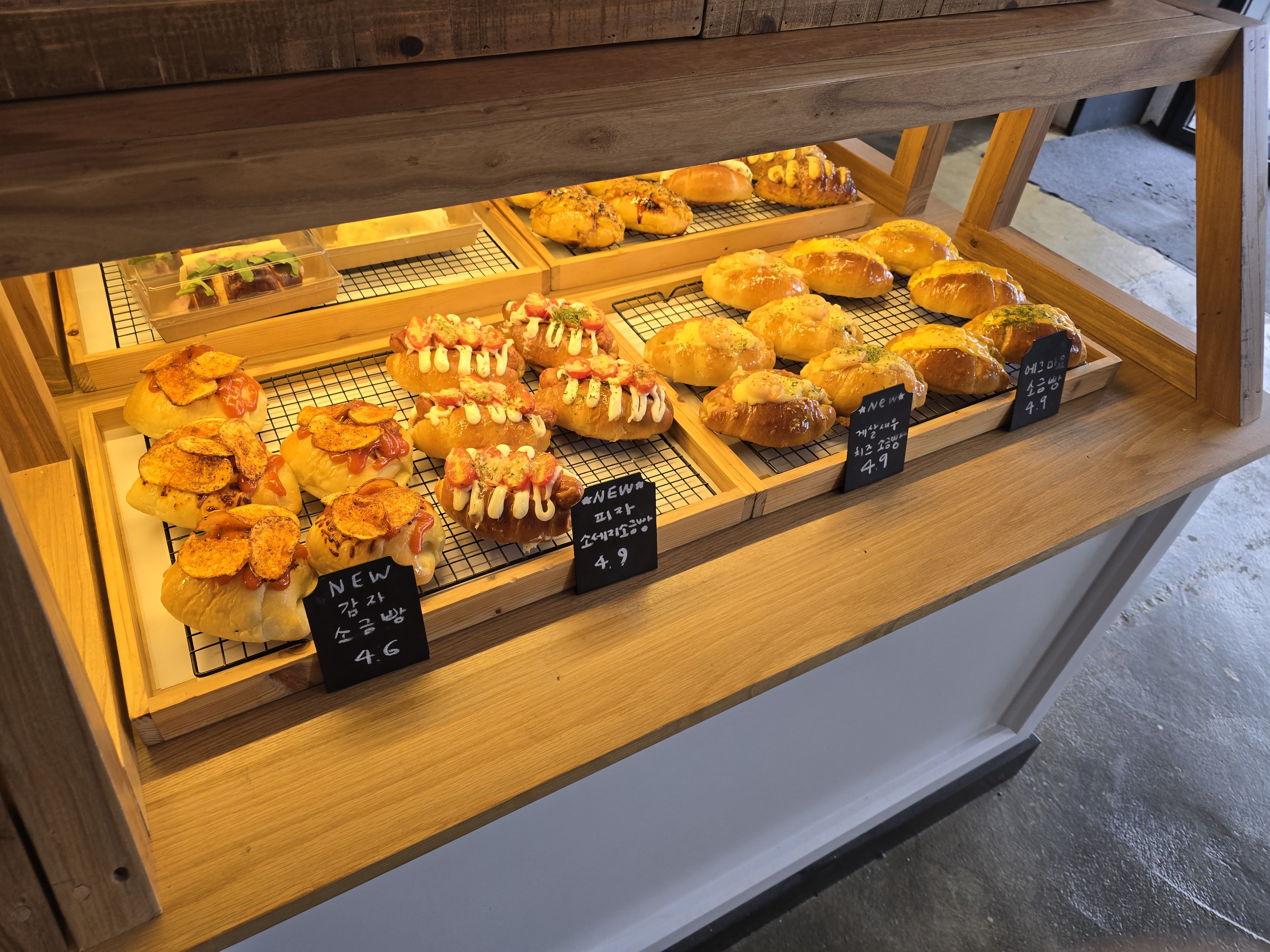 베이커리 진열대에는 소금빵이 종류별로 진열되어 있는데 모두 먹음직스러워 보였어요.