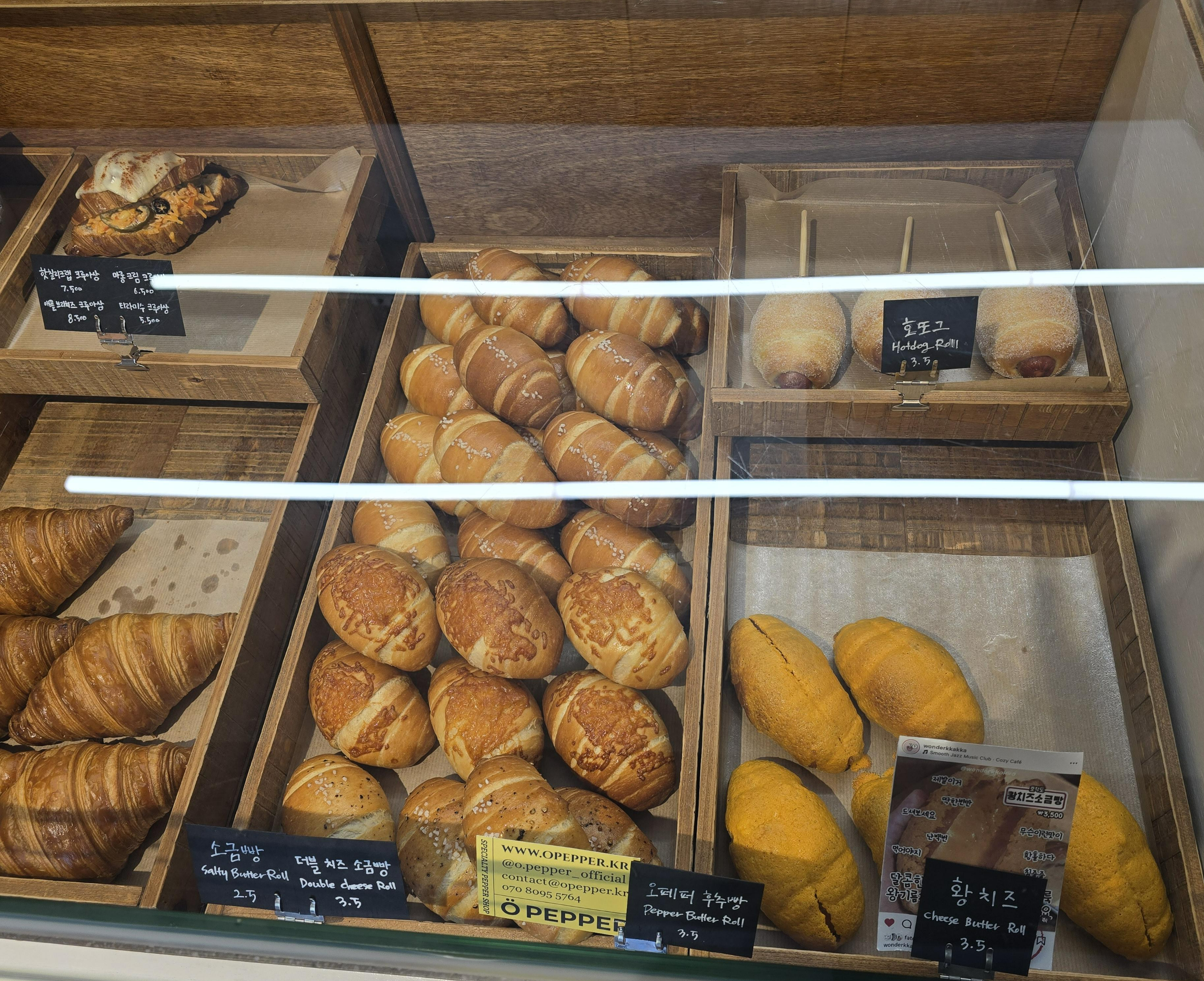 대표 메뉴는 크루아상과 소금빵으로 다양한 종류의 크루아상과 소금빵이 준비되어 있습니다.