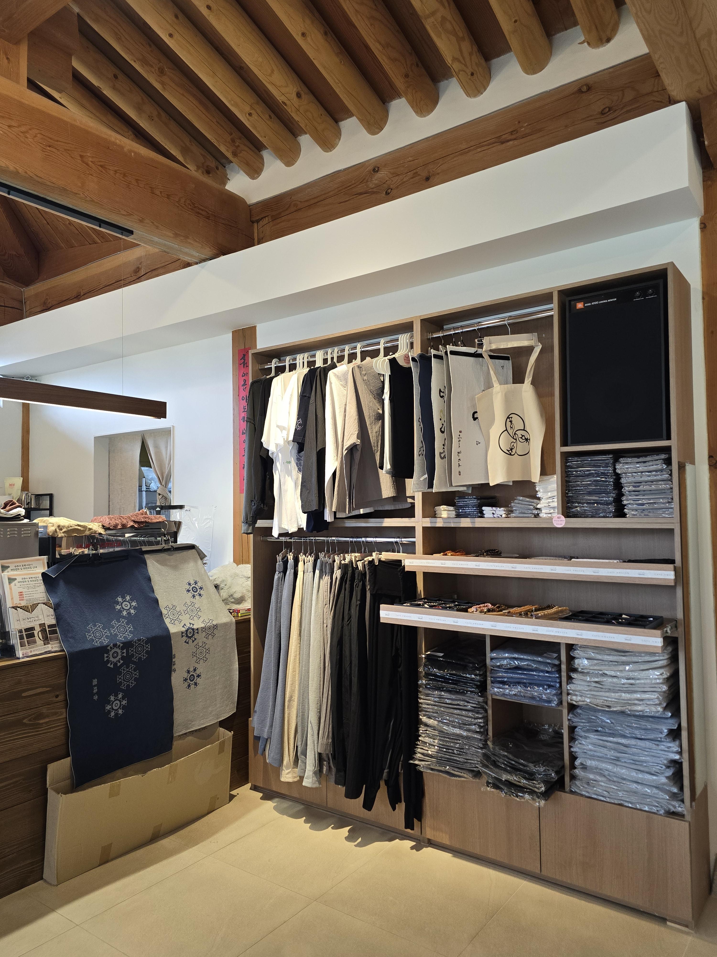 카페 입구 왼쪽에 음료와 디저트 주문하는 카운터와 판매하는 액세서리와 의류가 진열되어 있습니다.