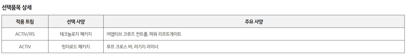 ● 액티브 선택 옵션 : 테크놀로지 패키지-650,000원, 힛더로드 패키지-430,000원, 선루프-700,000원